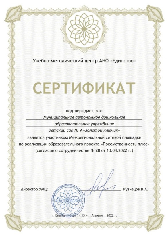 МАДОУ детскому саду № 9 "Золотой ключик" присвоен статус Межрегиональной сетевой площадки по реализации образовательного проекта «Преемственность плюс- финансовая грамотность» (согласие о сотрудничестве № 28 от 13.04.2022 г.)